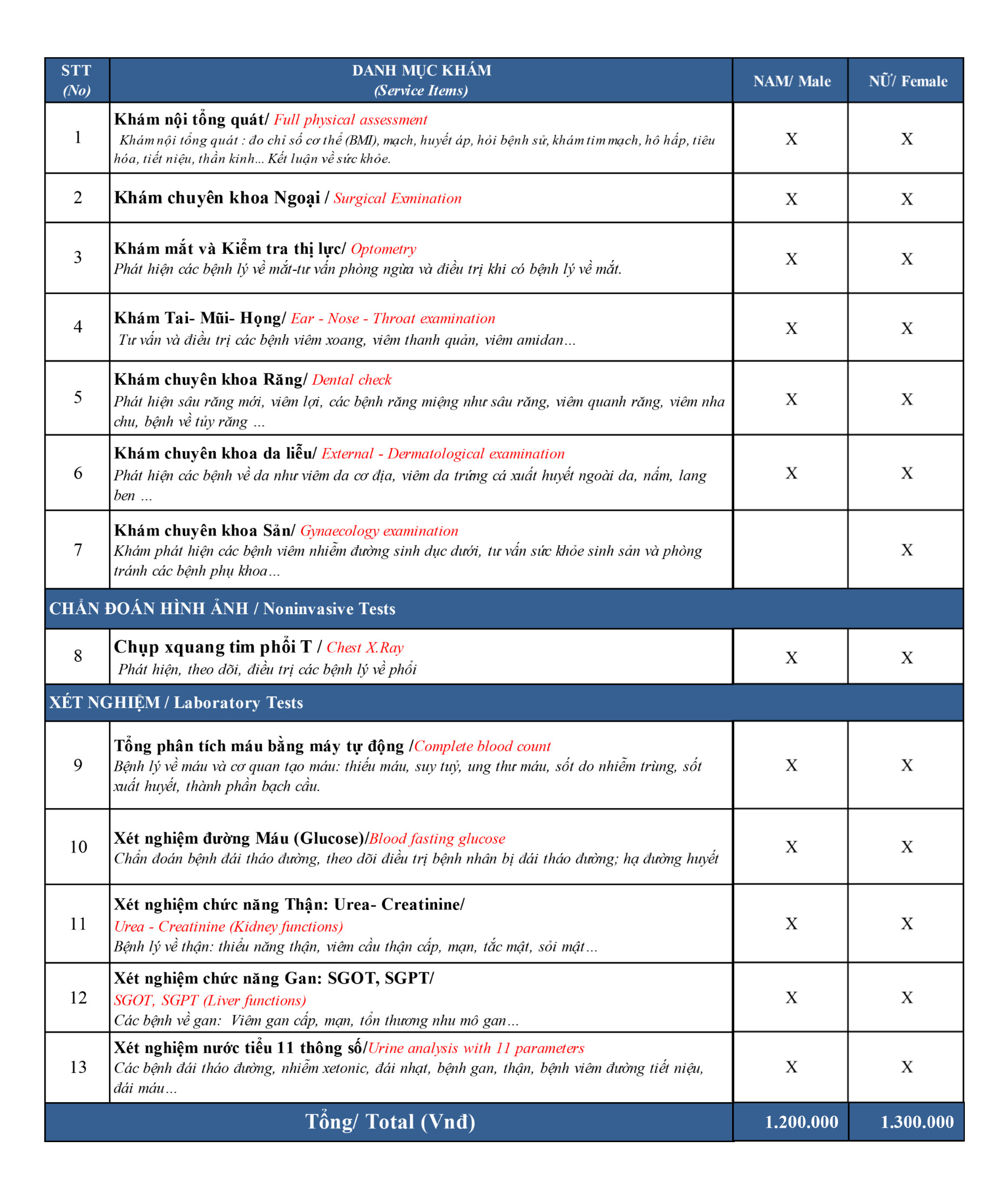 Gói khám sức khoẻ tổng quát Work permit- Cấp giấy phép lao động có đầy đủ các dịch vụ cơ bản như: Khám nội đa khoa tổng quát, khám chuyên khoa (tai mũi họng, thị lực, nha khoa, phụ khoa – vú – dành riêng cho nữ, da liễu…) Xét nghiệm: Đo hoạt độ AST (GOT), Đo hoạt độ ALT (GPT), HBsAg miễn dịch tự động…