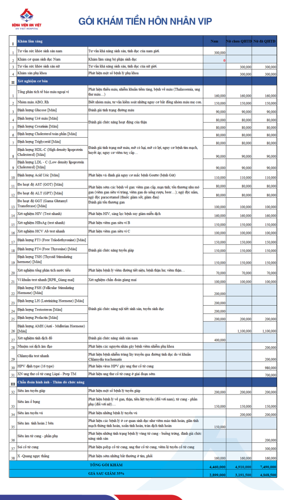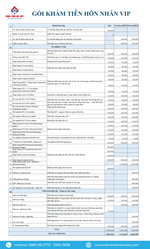2. Danh mục gói khám tiền hôn nhân VIP tại bệnh viện An Việt