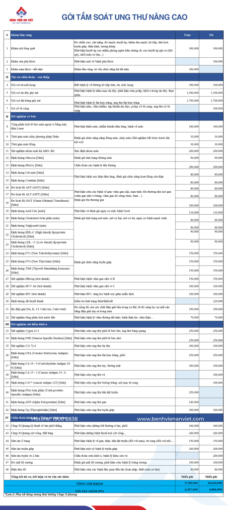 Tại bệnh viện An Việt, gói khám được thiết kế khoa học – đầy đủ – riêng tư với hơn 40 dịch vụ khám được gửi đến khách hàng, bao gồm: