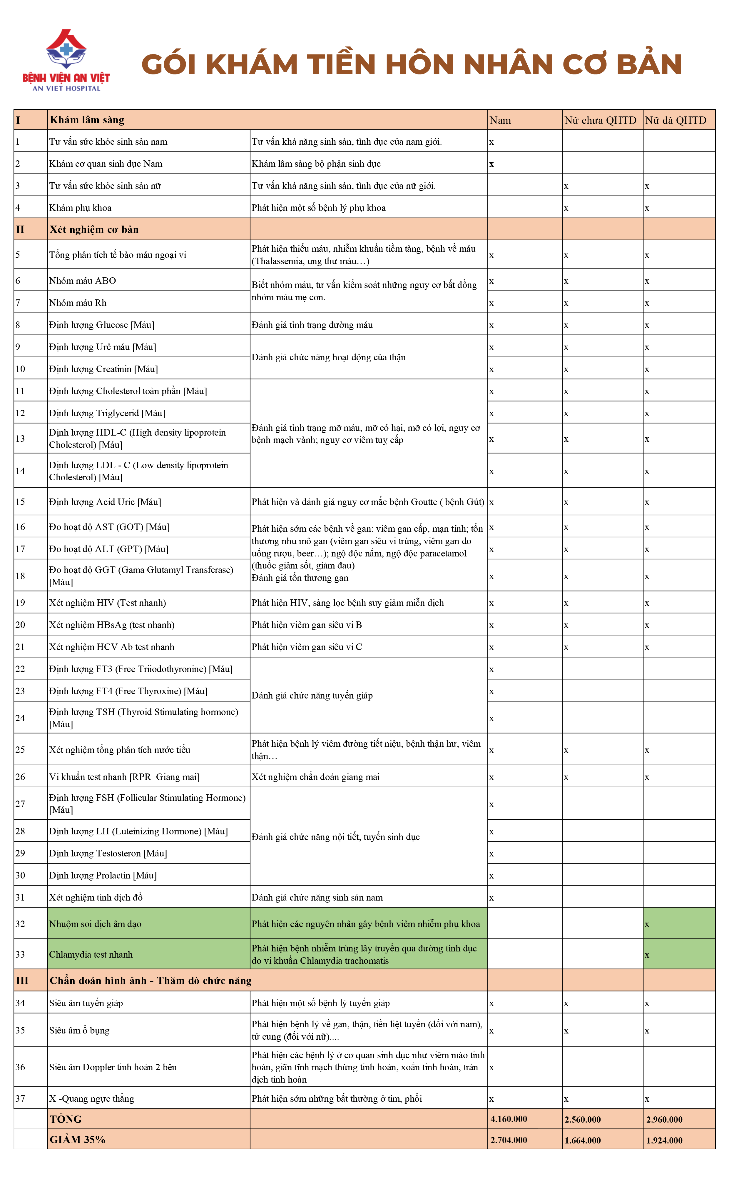 Bệnh viện đa khoa An Việt đang áp dụng chương trình giảm 35% cho toàn bộ khách hàng đặt lịch trước gói khám tiền hôn nhân qua các kênh online của bệnh viện.